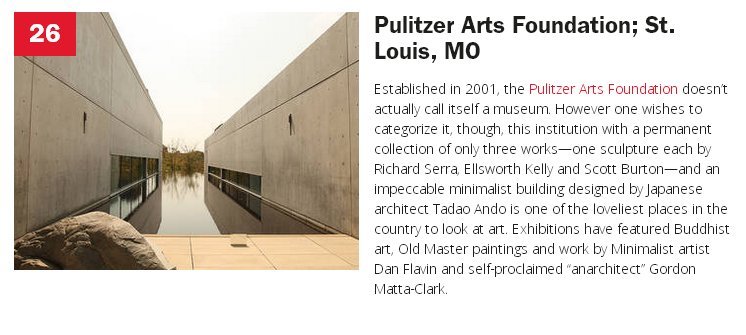 Congratulation to the Pulitzer Arts Foundation! TimeOut Magazine listed the foundation as one of the 26 best art museums in America (10/2015)