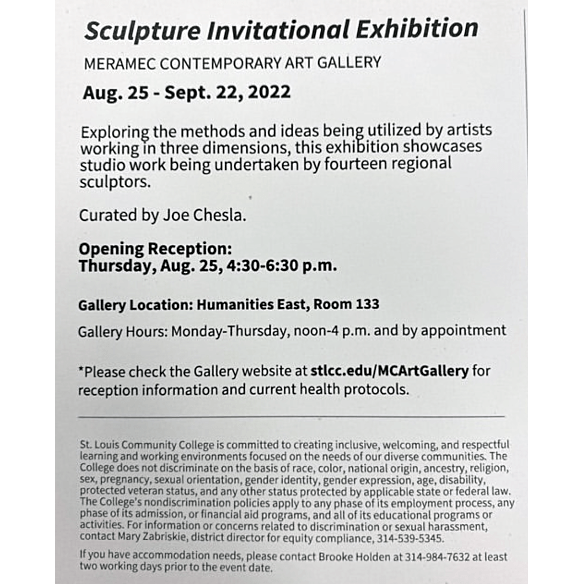 Gallery Artist Christina Shmigel’s sculpture is included in the group exhibition “Sculpture Invitational” curated by Joe Chelsa at the Meramec Contemporary Art Gallery, St. Louis, MO (8/25-9/22). More at https://stlcc.edu/campus-life-community/cultural-arts/art-galleries/meramec-art-gallery/