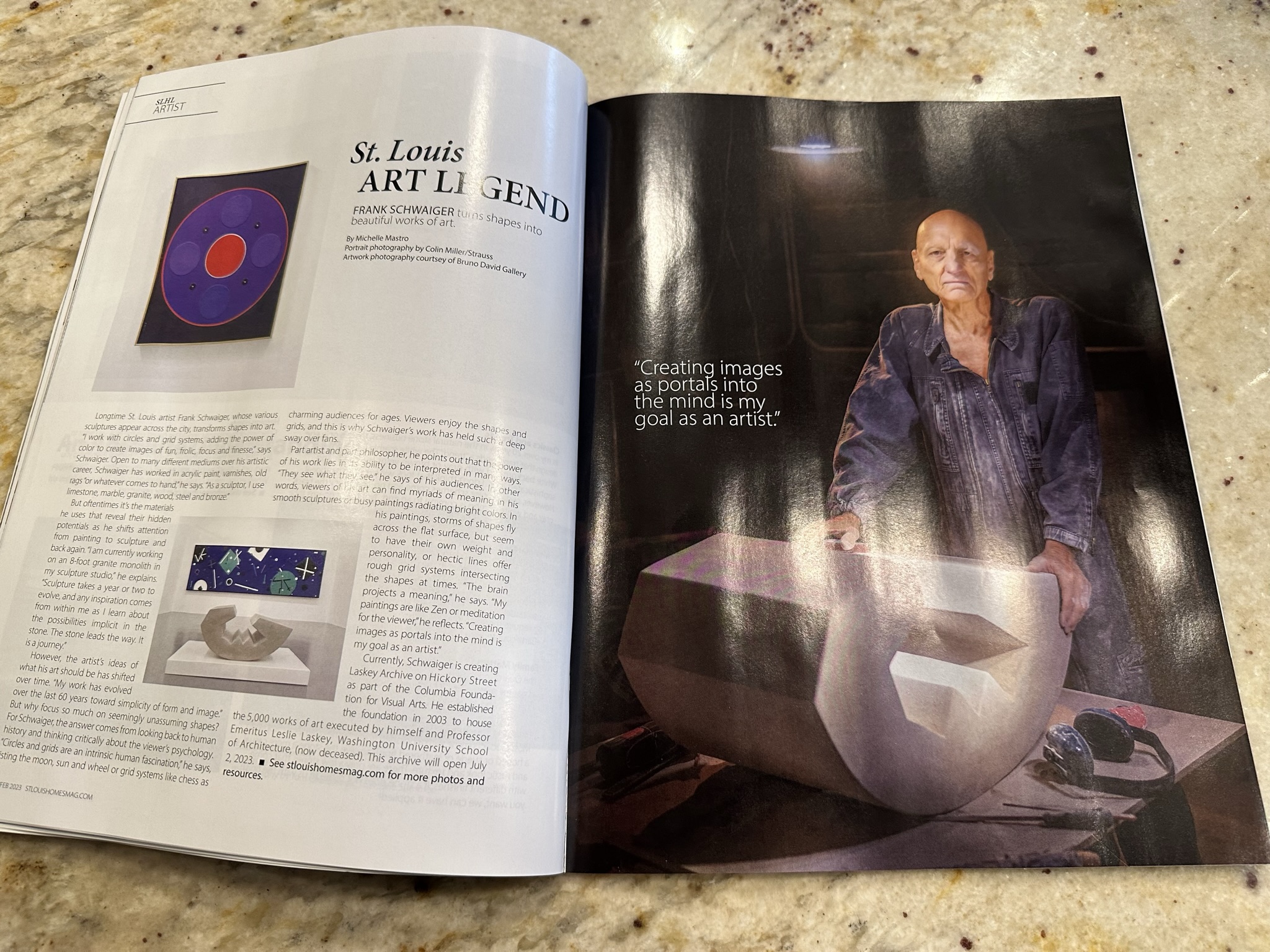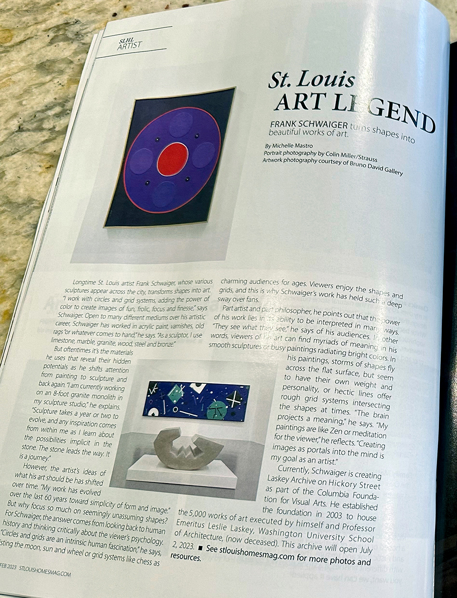 Terrific article “Frank Schwaiger Turns Shapes Into Beautiful Works of Art” by Michelle Mastro in the St. Louis Homes Magazine. Last day to see his exhibition is Saturday, January 14. Frank along with Charles Turnell and Chip Reay will be talking about their works on this last day at 4 pm. Read article at https://stlouishomesmag.com/article/2504