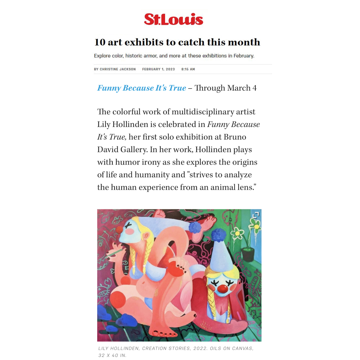 Great shout-out by Christine Jackson in the St. Louis Magazine on Lily Hollinden current exhibition “Funny Because It’s True” at Bruno David Gallery. Read shout-out