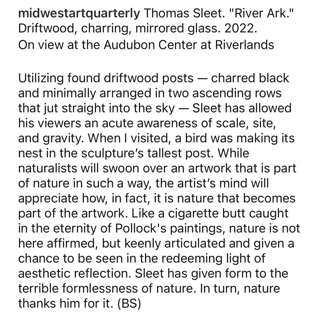 Wonderful words on Thomas Sleet’s “River Ark” installation at the Audubon Center at Riverlands (St. Louis) from the fantastic publication Midwest Art Quarterly by Bret Schneider. Read article at https://midwestartquarterly.org/